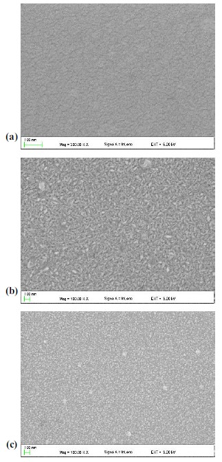 The microscopic images were registered with a Zeiss Supra 35 using an accelerating voltage of 3÷5 kV. To get images of the surface morphology, the secondary electron (in-lens) detector was used because the specimen and the thin films are very smooth. It was necessary to use high magnification (100 000x and higher) to see surface elements. The surface morphology of the Al2O3, ZnO, and TiO2 thin films was examined. The topography of the thin films prepared by the ALD method is homogeneous and smooth (Fig. 1).