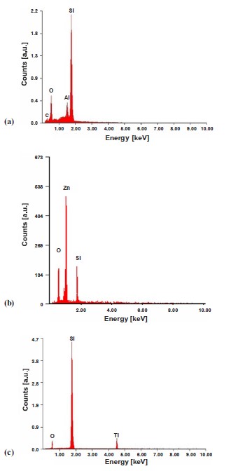 The microanalysis of the deposited thin films has been registered with the X-ray EDS. The tests using EDS were aimed at showing that the obtained thin films are homogeneous and free of impurities. Only peaks from elements present in the layer or substrate were recorded. In EDS testing for metallic elements, high voltages from 10 keV are usually used. The lower voltage applies only to light elements. The EDS spectra of thin films of Al2O3, ZnO, and TiO2 are shown in Fig. 2, respectively. In the spectrum of the Al2O3 thin film, peaks of 0.525 and 1.486 keV were recorded, which are from oxygen and aluminium, respectively. Peaks were also recorded for silicon (from the substrate) and for carbon which is always present in the environment. In the spectrum of a ZnO thin film, peaks of 0.525, 1.012, and 8.630 keV were recorded which are from oxygen and zinc, respectively. In the last case, peaks from oxygen and titanium from the thin film and silicon from the substrate were recorded.