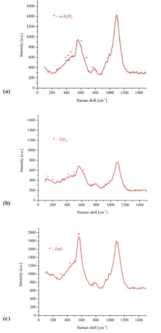 In the theoretical group analysis, the representation of alpha-aluminium oxide for optical modes is given as 2A1g + 2A1u + 3A2g + 2A2u + 5Eg + 4Eu. In Raman scattering, vibrations with symmetry A1g and Eg are active. Therefore, seven phonon modes are expected in the Raman shift, at or close to: A1g at 418 and 645 cm-1, and Eg at 379, 431, 450, 578, 750 cm-1. All active modes were registered and shown in Fig. 3(a). In the theoretical group analysis, the titanium dioxide representation has six active Raman modes: 3Eg + 2B1g + A1g. The Eg modes are symmetric stretching of Ti–O bonds. The B1g and A1g are symmetric and antisymmetric bending motions of O–Ti–O, respectively. Their values are at or close to: Eg at 144 cm-1, at 197 cm-1, and at 638 cm-1, B1g at 399 cm-1, and at 513 cm-1, A1g at 519 cm-1. All active modes were registered and shown in Fig. 3(b). In the theoretical group analysis, the representation of zinc oxide is given as 1A1 + 2B1 + 1E1 + 2E2. The optical phonons of ZnO are observed at 327 cm-1, 433 cm-1, and 566 cm-1 which is shown in Fig. 3(c). The peak at 433 cm-1 arises from the first-order Raman scattering by the E2 phonons, which ensures the good ZnO crystal quality. The E2 modes in ZnO of non-polar optical phonons are assigned to the wurtzite structure.