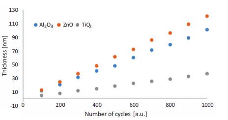 The Al2O3, ZnO, and TiO2 thin films prepared with a number of cycles from 100 to 1000 were measured. Based on the calculated thicknesses, it was possible to designate the average speed of thin-film growth through one ALD cycle. The aluminium oxide is characterised by approximately 0.1 nm per cycle, for zinc oxide it is 0.12 nm, per cycle and for titanium oxide thin film it is 0.035 nm per cycle. Subsequently, AR coating consisting of two thin films with different thickness and composition was obtained using Al2O3 ZnO, and TiO2 materials.