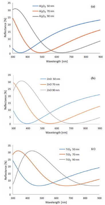 Single AR coatings allow minimization of light only in a small range. The Al2O3 thin film with a thickness of 90 nm has its minimum reflection in the range of 600– 700 m. Reducing the thickness shifts the minimum to shorter wavelengths [Fig. 6(a)]. Since ZnO has a higher index of refraction than Al2O3 at the same thickness (e.g., 90 nm), the minimum of reflection occurs at longer wavelengths (700–800 nm). As in Al2O3, the tendency of changing the reflection minimum to shorter wavelengths with the reduction of a thin-film thickness is similar [Fig. 6(b)].