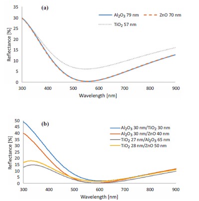 Since a single thin film only minimizes reflection in a narrow range, and beyond that, reflection increases significantly. The possibility of minimizing the reflection using a double thin-film AR coating consisting of a combination of Al2O3, ZnO, and TiO2 films was investigated. The best results were obtained for TiO2 27nm/Al2O3 65 nm [Fig. 7(b)]. In the wavelength range of 500–700 nm, the light reflection was below 5%, while in the literature for classic AR coating such as SiO2/TiO2, the reflection was between 8–10% [22] and similar results for Si3N4 [28].