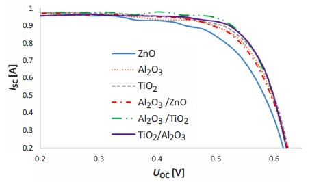 Current-voltage characteristics of silicon photovoltaic cells with selected single and double AR coatings were measured (Fig. 8). On their basis, the electrical parameters of the solar cells were determined (Table 1). The solar cell with the highest efficiency of converting solar radiation into electricity was obtained for Al2O3/TiO2. The performance of such a photovoltaic cell was 18.74%.